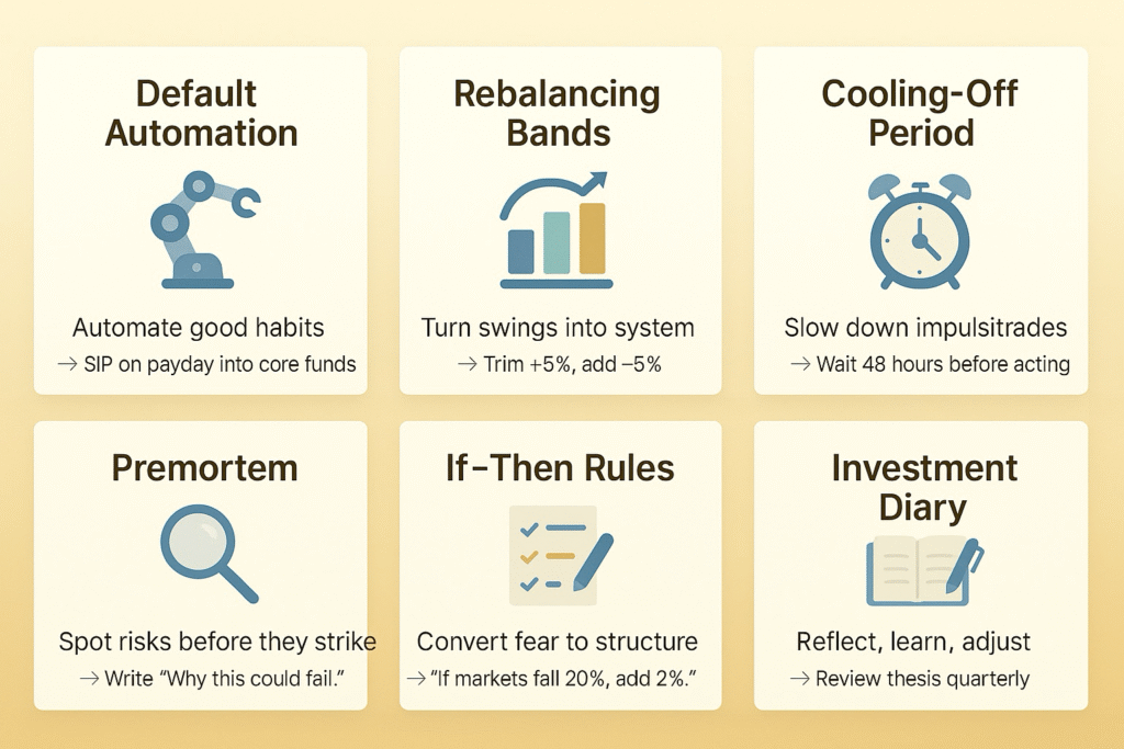 | If–then rules | Converts fear into triggers | “If markets fall 20%, then add 2% to equities monthly for three months.” |